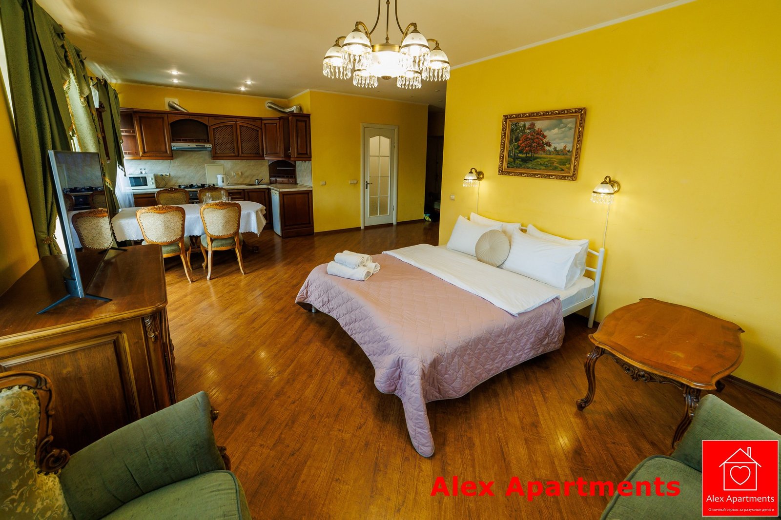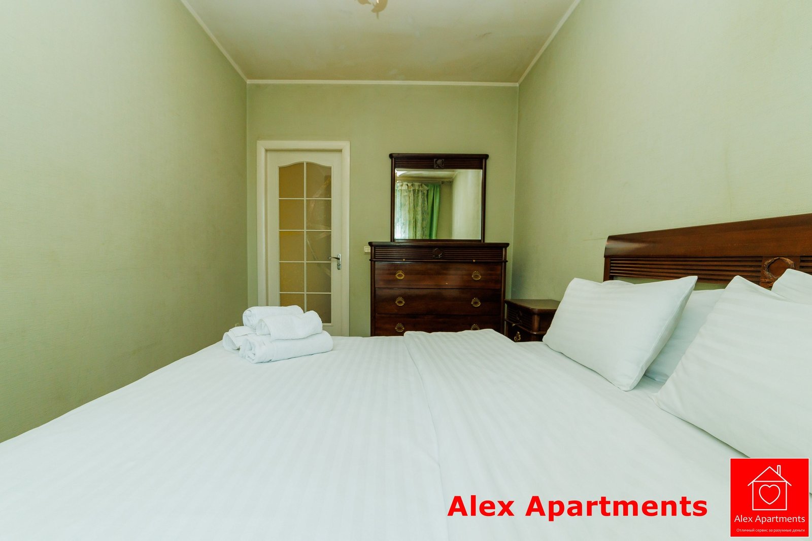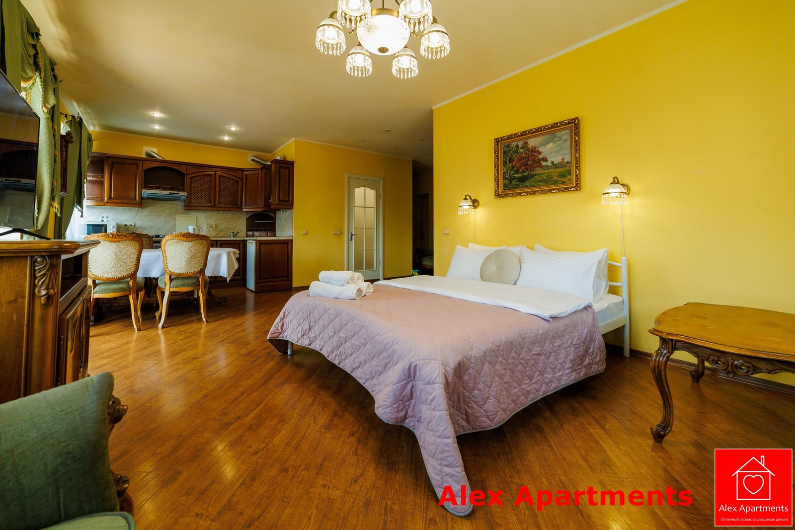 • Спальня 1: Ліжко велике King-size. Білосніжна постіль з сатину 100% бавовни. Застеклений балкон із видом на тиху вулицю.
