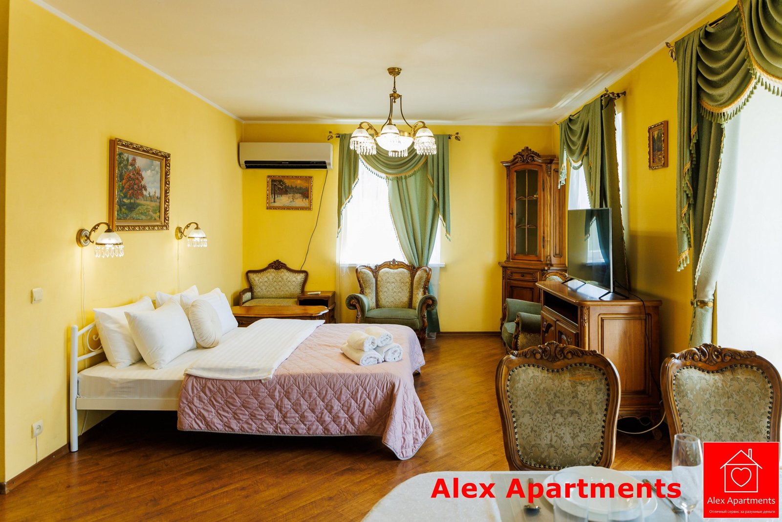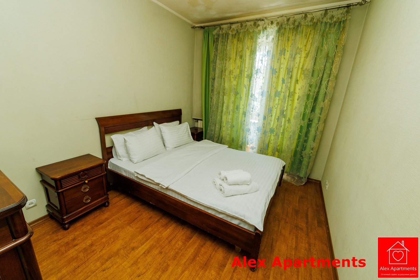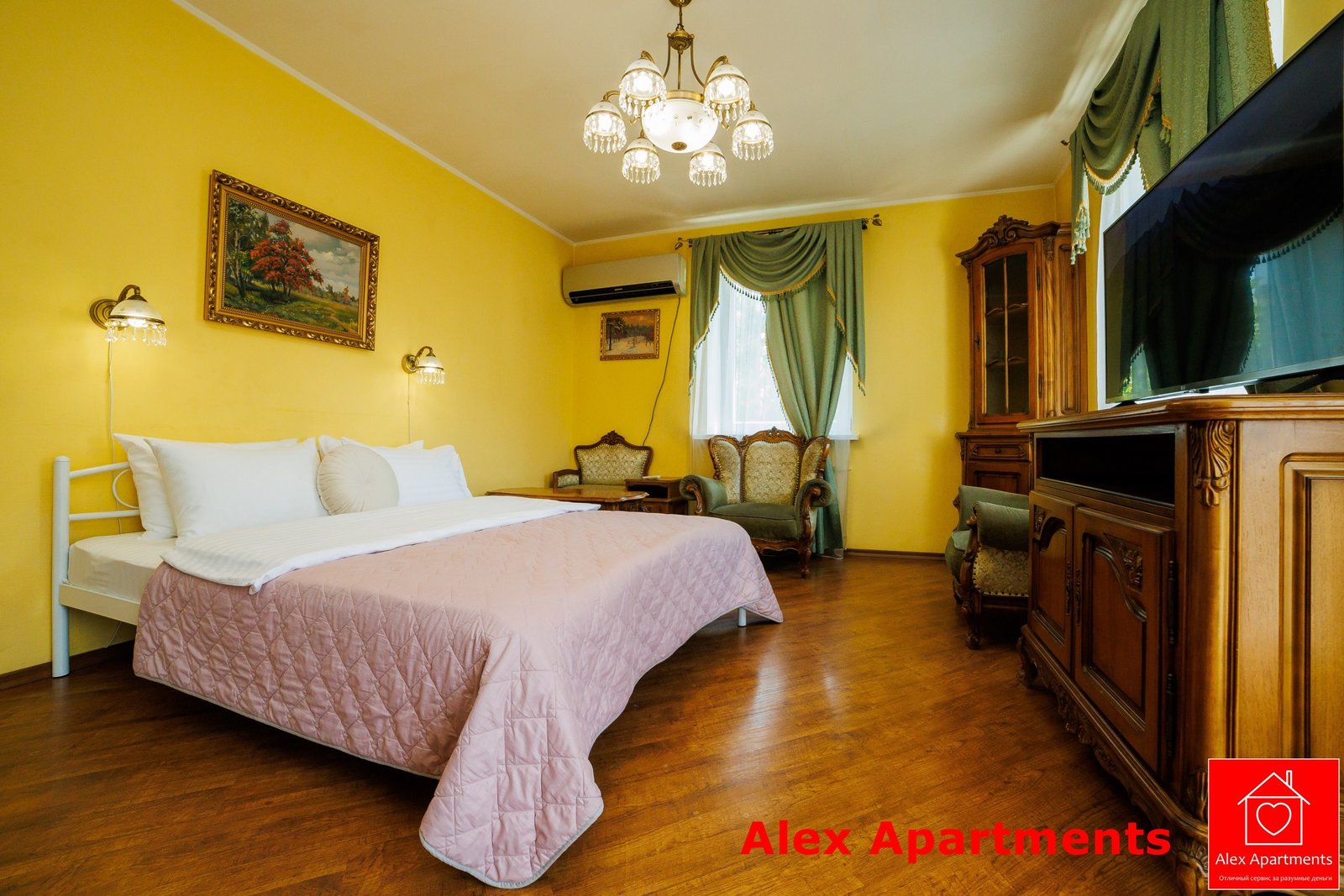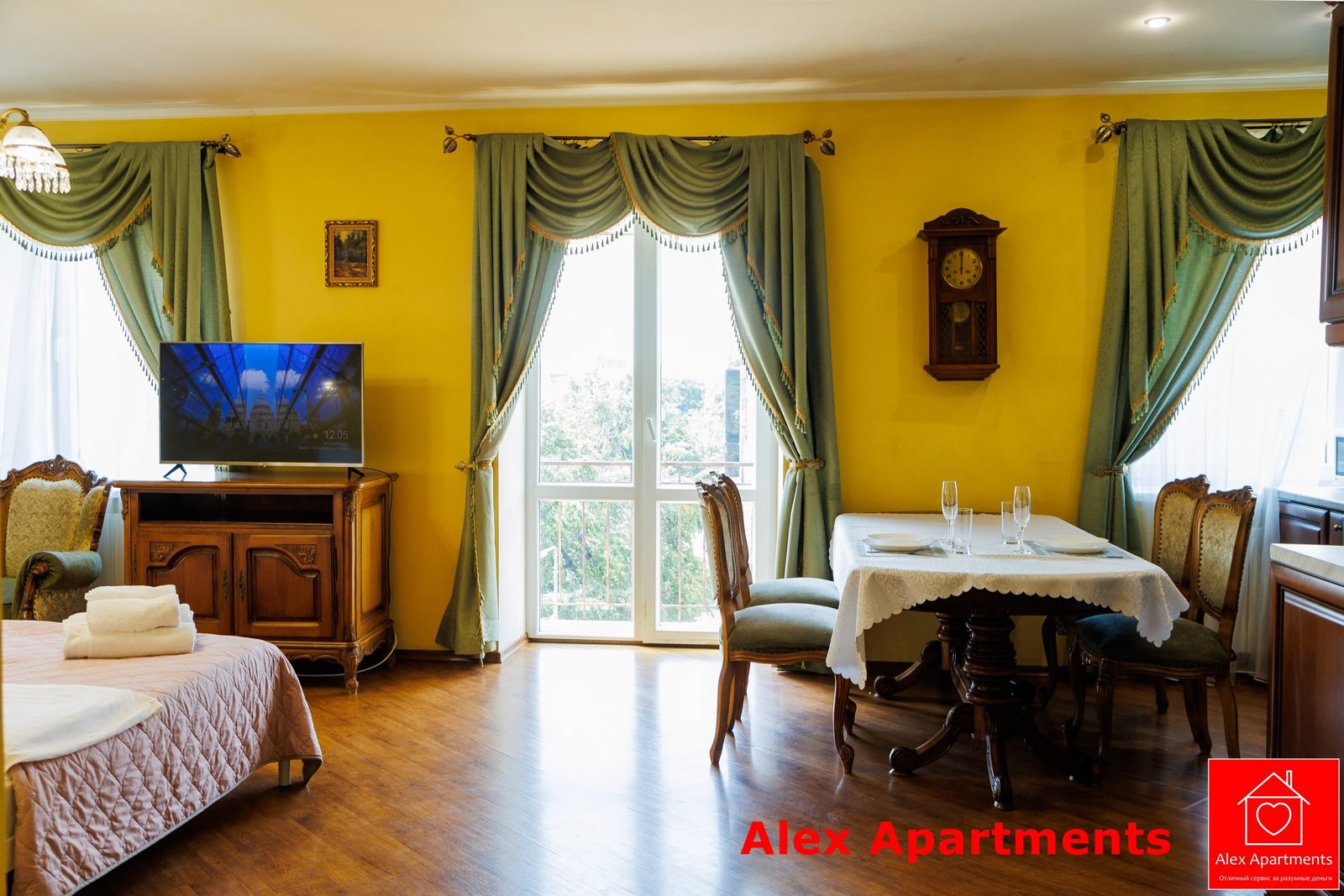 • Спальня 1: Ліжко велике King-size. Білосніжна постіль з сатину 100% бавовни. Застеклений балкон із видом на тиху вулицю.
