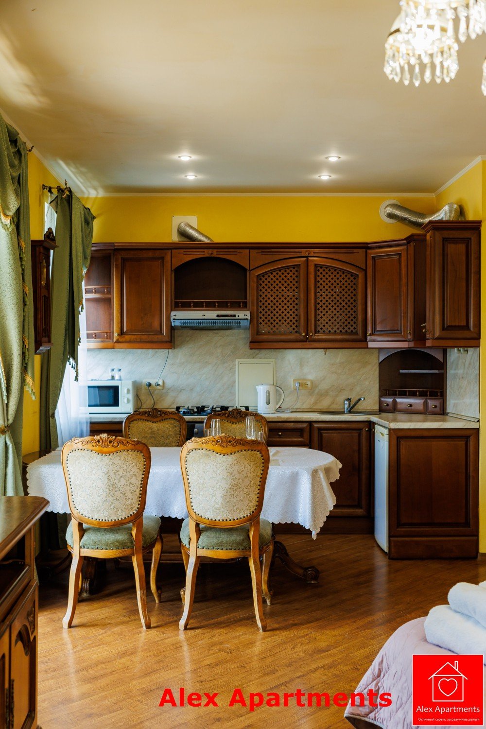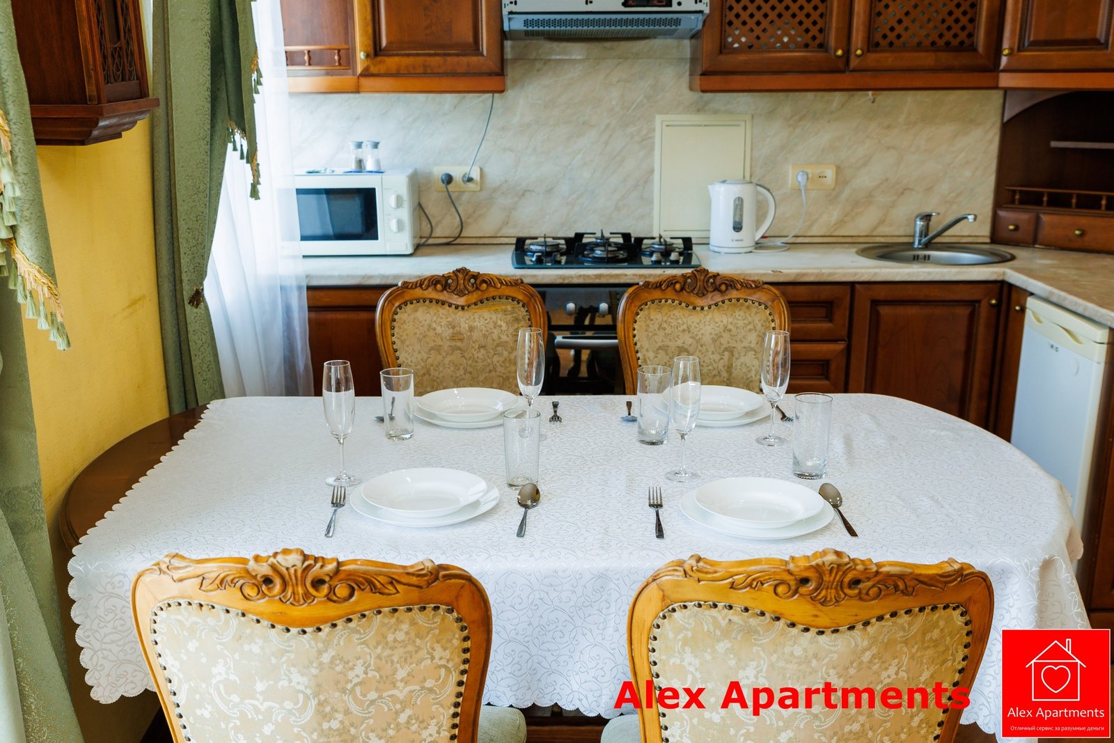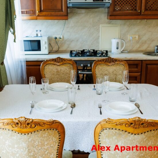 • Кухня-Вітальня: Холодильник. Електрична плита. Мікрохвильова піч. Електрочайник. Обідній стіл. Повний набір кухонного приладдя: каструлі, сковорідки, посуд, фужери, штопор.